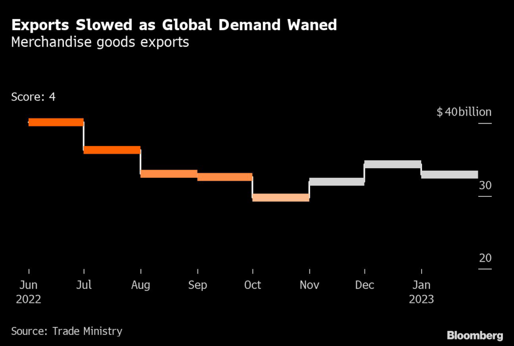Exports fell 6.58% in January from a year ago to $32.9 billion, data released by the Trade Ministry showed, indicating lower demand for goods abroad.