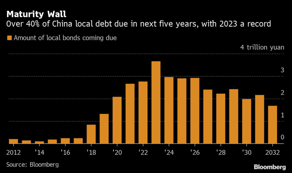 Bonds worth almost 15 trillion yuan — more than 40% of their outstanding debt — are due in the next five years.