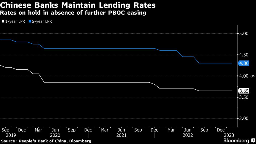 (Bloomberg) — Chinese lenders followed the central bank by keeping their benchmark lending rates unchanged Monday, with analysts expecting possible reductions in coming months to support the economic recovery.