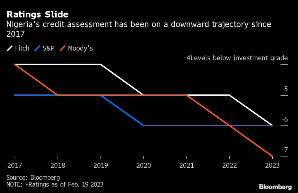 Moody’s Investor Service cautioned that whoever wins will struggle to carry out urgent fiscal reforms because of “social and institutional constraints,” according to a report last month announcing its downgrade of Nigeria’s long-term foreign-debt rating to Caa1 from B3.