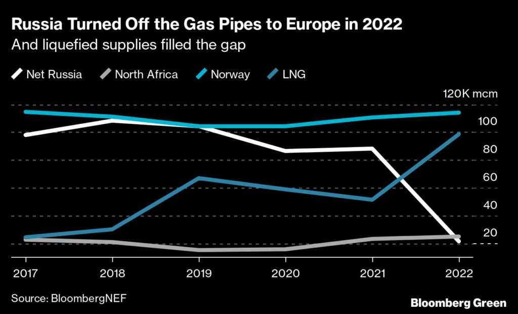 Most came on ships in the form of LNG, or liquefied natural gas. “Initially when the war kicked off it was very pessimistic and I didn’t know how the market would have coped without Russian gas,” said Arun Toora, analyst at BloombergNEF.