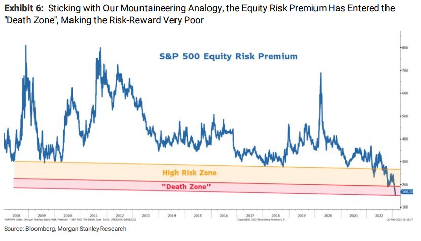 That doesn’t bode well for stocks as the sharp rally this year has left them the most expensive since 2007 by the measure of equity risk premium, which has entered a level known as the “death zone,” the strategist said.
