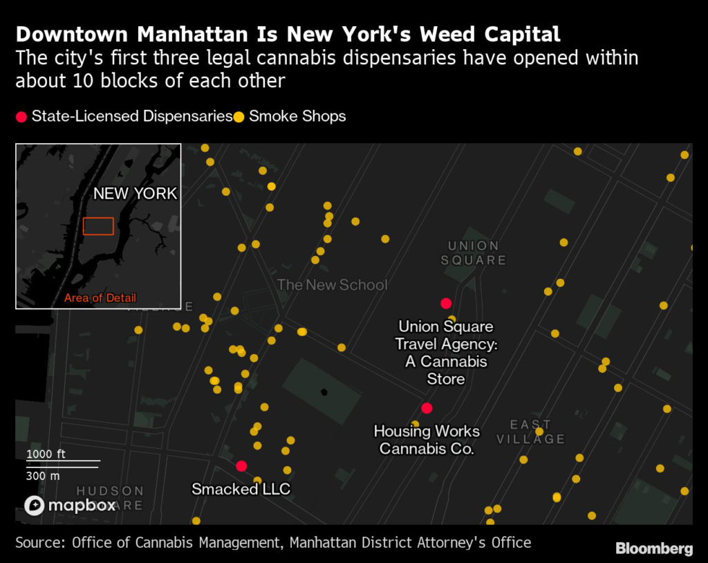 (Bloomberg) — New York City’s rollout of legal weed hasn’t gone very far. A quirk in the way the state doles out its first licenses gives shops a lot of leeway in where they open.