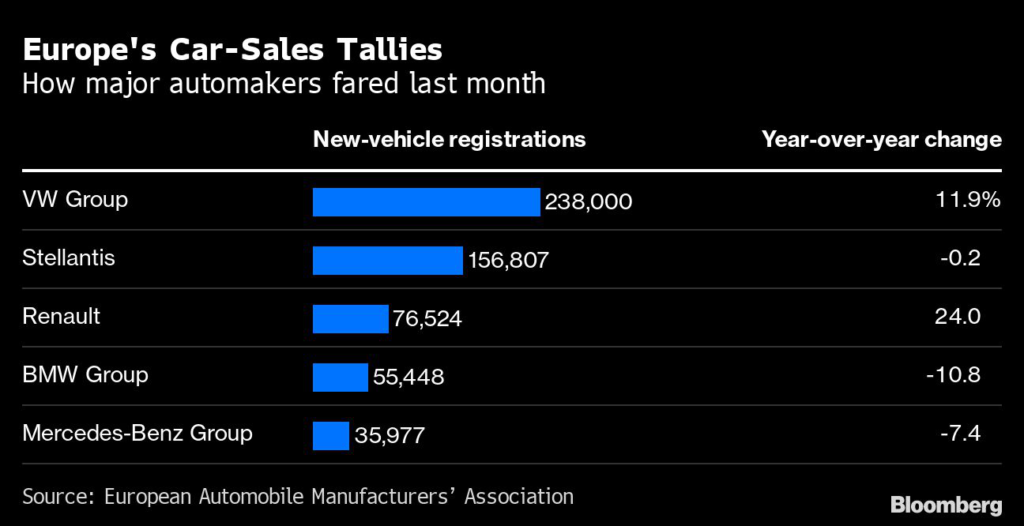 (Bloomberg) — Auto sales in Europe rose for a sixth month, led by robust growth in Spain and Italy, as supply issues ease and fuel hopes for a rebound from pandemic doldrums.
