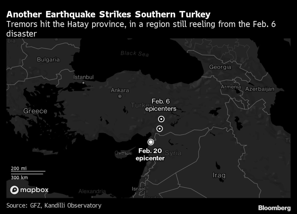 (Bloomberg) — A pair of earthquakes measuring 6.4 and 5.8 in magnitude struck Turkey’s southeastern Hatay province Monday, two weeks after major tremors in the same area left tens of thousands of people dead.