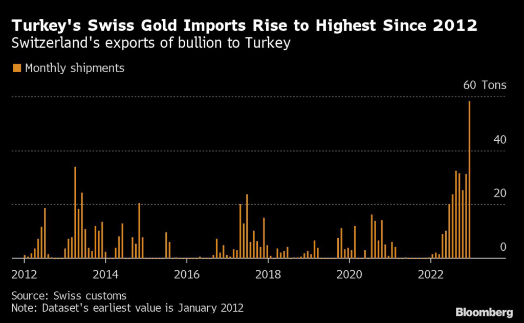 Turkey’s gold imports from Switzerland rose to the highest since at least 2012 in January as the country’s soaring inflation spurred demand for the precious metal.
