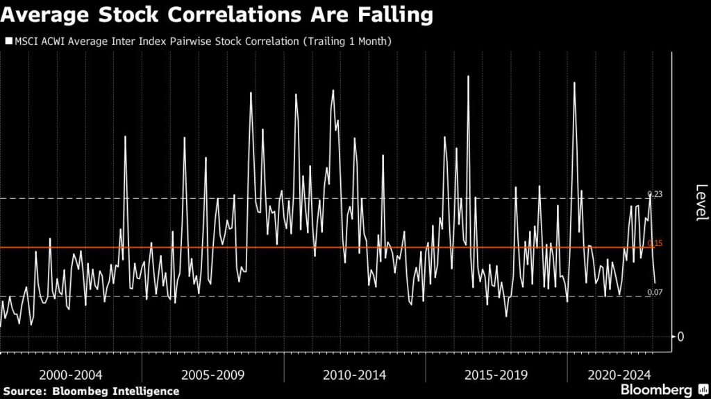 The MSCI All Country World Index’s average pairwise correlation reading in January touched the lowest since October 2021, while the variance in one-month returns spiked to an above-average level, off pandemic lows, Bloomberg Intelligence strategists Gina Martin Adams and Gillian Wolf, wrote in a Feb.