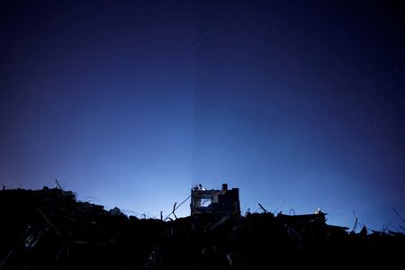 In the pitch-black streets, passing headlights revealed mounds of rubble, frames of broken windows, and entangled rebar.
