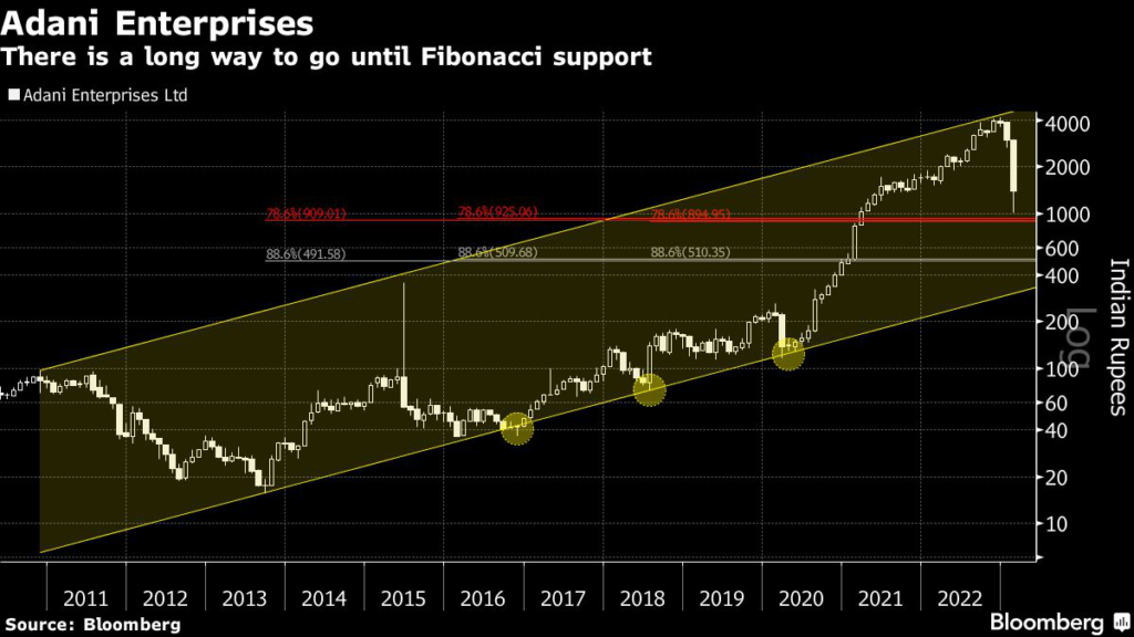 (Bloomberg) — The rout in Adani Group shares has room to run based on charts that show key stocks in Gautam Adani’s empire may still extend declines to the 85% downside flagged by Hindenburg Research.