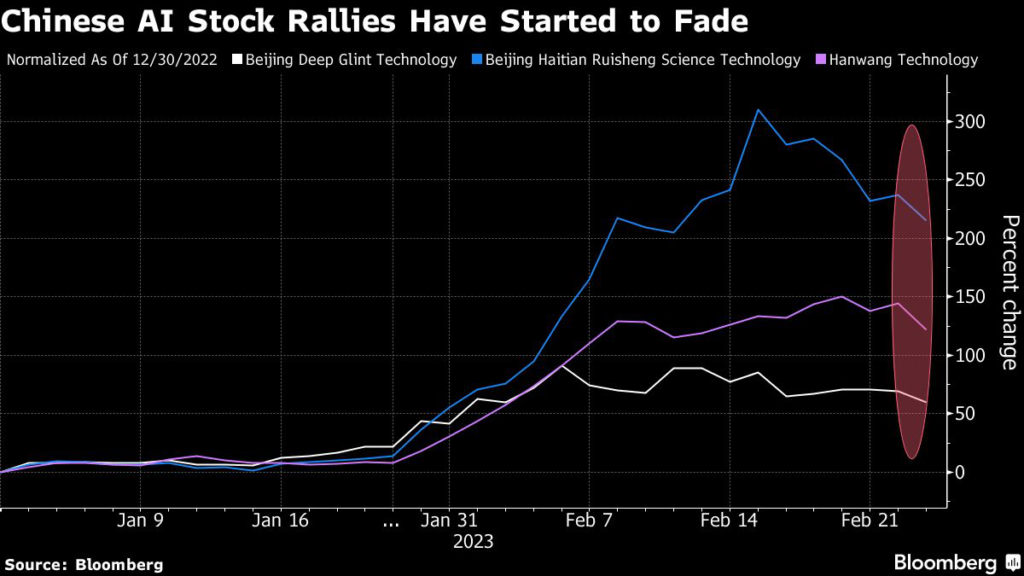 Hanwang Technology Co. slid by as much as its 10% daily limit after more than doubling in the past month. Beijing Deep Glint Technology Co. continued to trim its big advance since saying earlier this month that it lacks the ability to offer ChatGPT-related services.