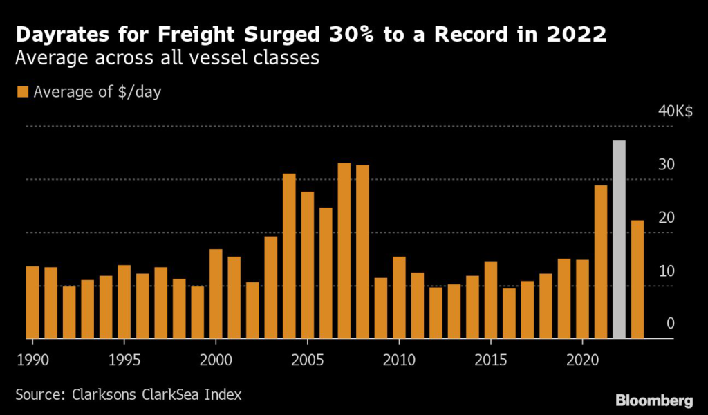 The ClarkSea index, a measure of average day rates across all vessel classes, averaged $37,253 per day last year, a 30% hike year-on-year and the highest since at least 1990, according to data from Clarkson Research Services Ltd., part of the world’s biggest shipbroker.