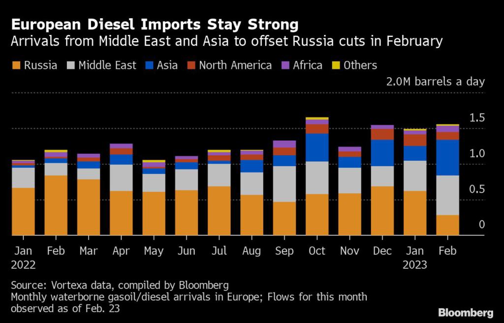 (Bloomberg) — Europe has been able to import large amounts of diesel in February even after the start of sanctions on purchases from Russia, its top external supplier until earlier this month.