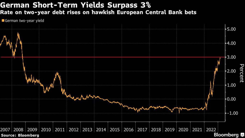 German two-year yields — among the most sensitive to changes in monetary policy — rose as much as 15 basis points on Friday to above 3.06% for the first time since 2008.