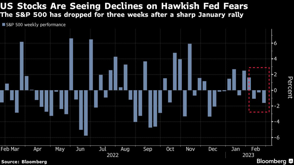US stocks have dropped in the past three weeks as signs of sticky inflation fanned fears that the Fed could pursue higher interest rates for longer.