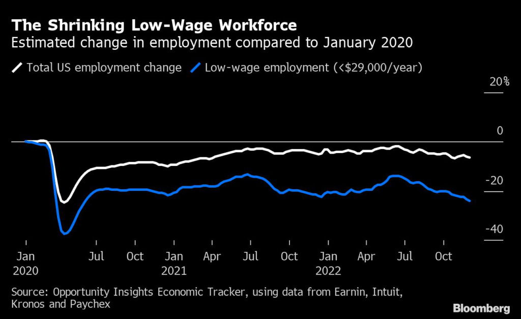 Harvard University economist Raj Chetty and his colleagues tracked another category of missing workers in a recent paper: low-wage service workers who were displaced from their jobs early in the pandemic and never came back.