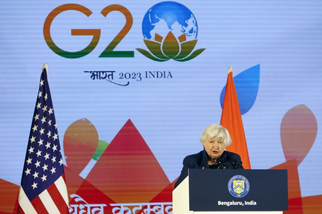 Speaking in a closed-door meeting Friday in Bengaluru, India, where G-20 finance ministers and central bank governors are gathered, Yellen reiterated calls to her counterparts to redouble efforts to restrict Russia’s capacity to wage war.