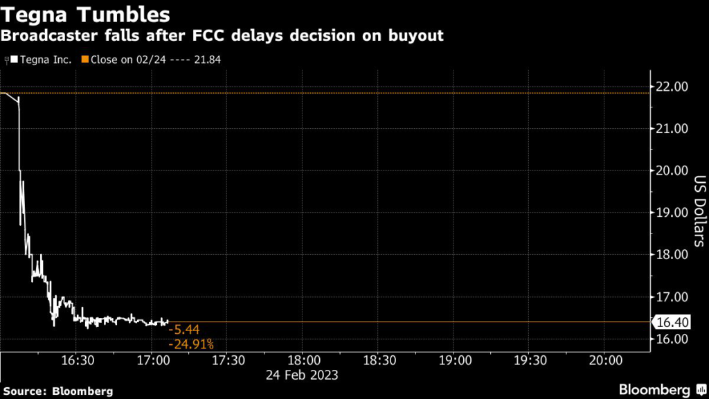 Shares of Tegna fell as much as 26% to $16.15 in extended trading after the announcement. Standard General is offering $24 a share for the company.