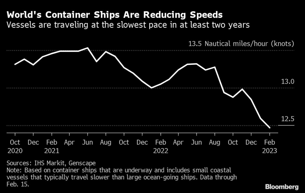Commodity watchers keen on taking the pulse of the global economy should note that container ships — the lifeblood of trade — are traveling at the slowest speeds since Bloomberg began tracking the data in October 2020.
