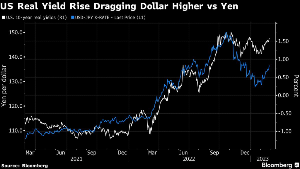 The Japanese currency typically weakens when inflation-adjusted US yields are rising, they said.