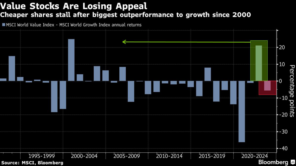(Bloomberg) — Last year’s strong outperformance in cheaper, so-called value stocks over growth peers is likely to reverse soon as the economic recovery slows, say JPMorgan Chase & Co.