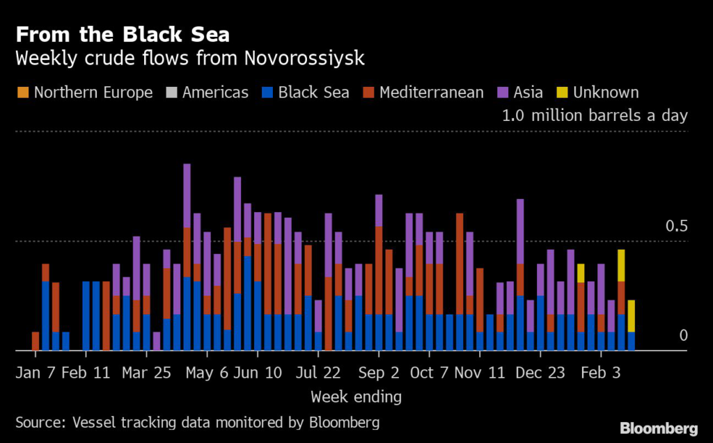 (Bloomberg) — A year on from Russia’s invasion of Ukraine, Moscow’s seaborne crude exports held close to the highest levels seen since its troops crossed the border, with record volumes leaving its Pacific ports.