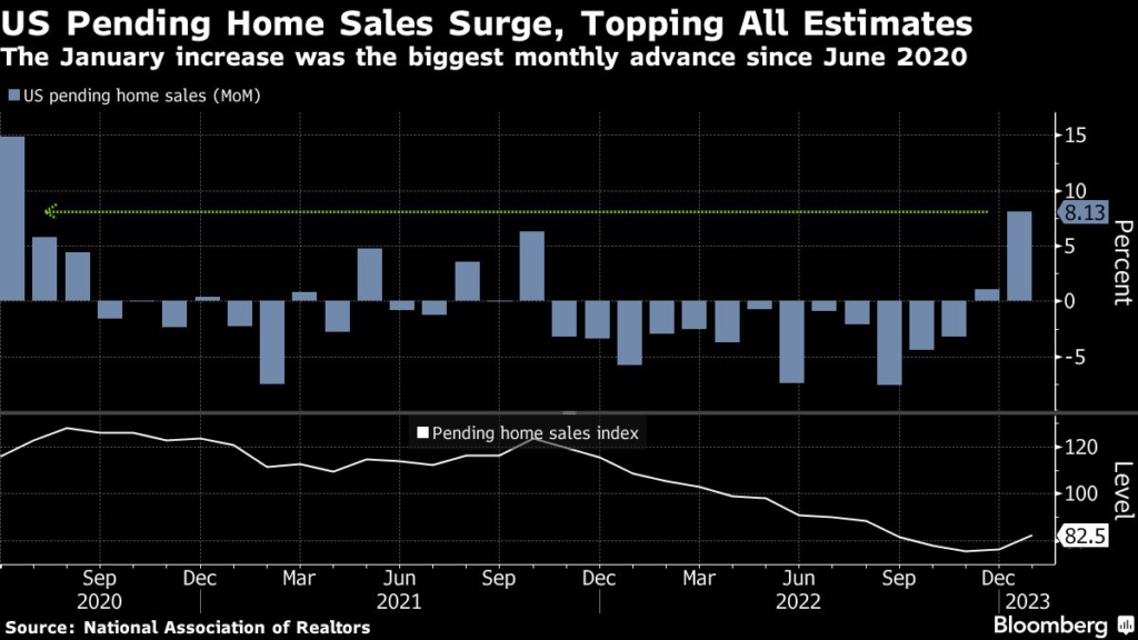 US pending home sales rose by the most since June 2020, potentially a temporary reprieve as lower mortgage rates in the month helped prop up demand.