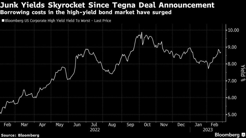 Average borrowing costs are still well above maximum interest rate levels banks likely committed to in February 2022 on the Tegna debt, potentially leaving banks on the hook for the difference.