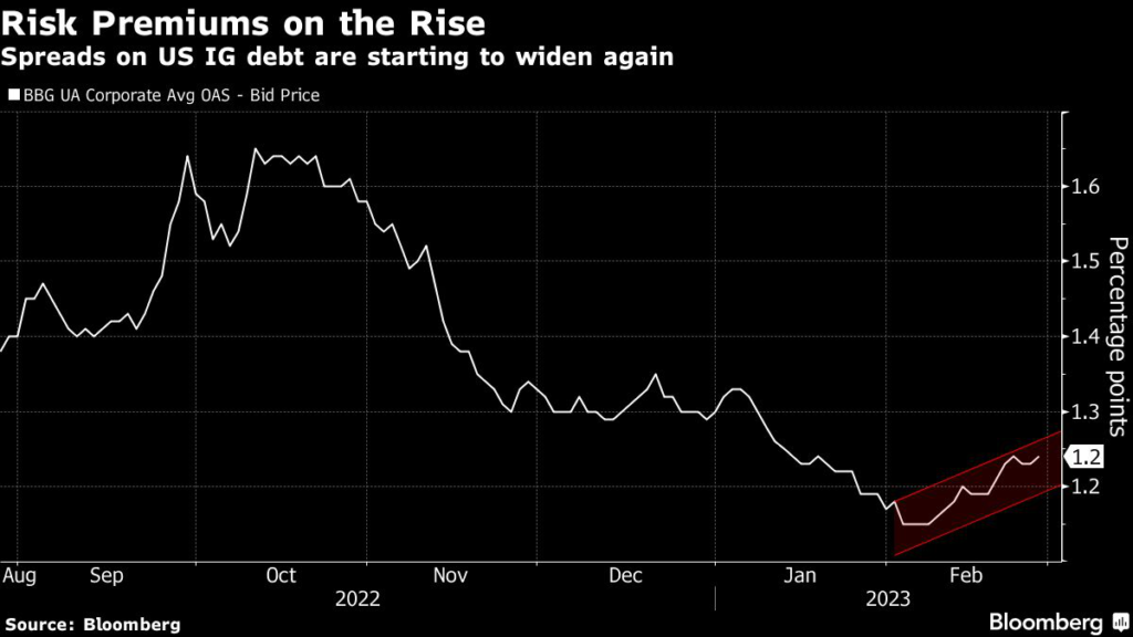 strategists led by Eric Beinstein wrote in a note. Risk premiums remain tight while investors are betting high-grade companies are robust enough to weather a downturn. Even so, the average high-grade spread is starting to tick up, according Bloomberg index data.