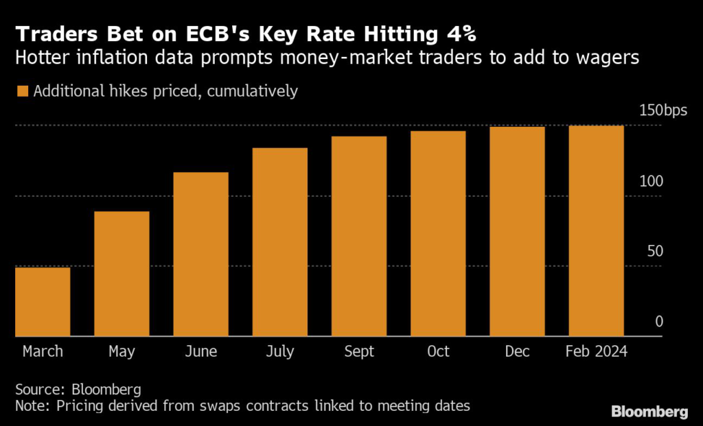 Money-markets traders briefly priced a 4% ECB terminal rate in the wake of the releases, which would exceed the peak in borrowing costs at the turn of the century.