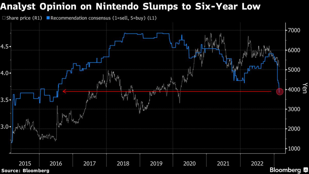 The rating cut to neutral from buy by Goldman pushed the consensus analyst opinion on Nintendo to the lowest since July 2016.