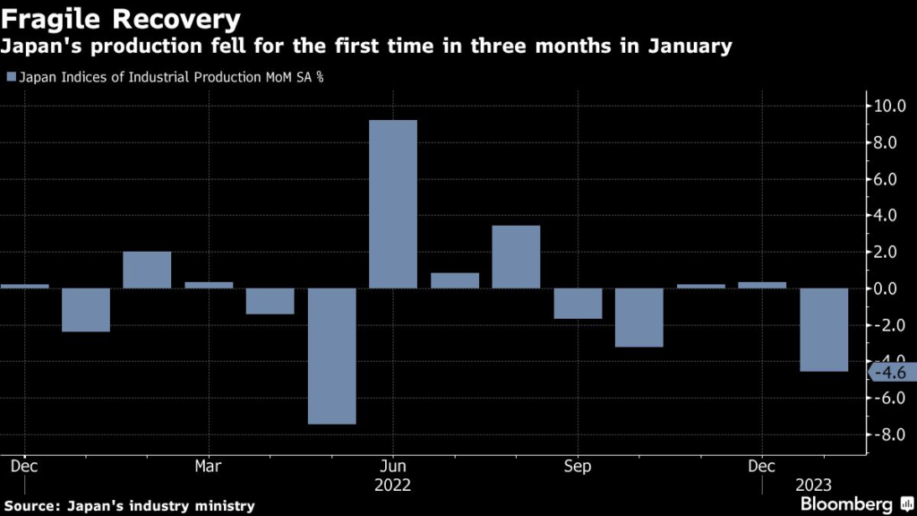 (Bloomberg) — Japan’s factory output fell for the first time in three months in January hit by a global slowdown and regional holidays while retail sales beat expectations, creating a mixed picture for Bank of Japan governor nominee Kazuo Ueda.