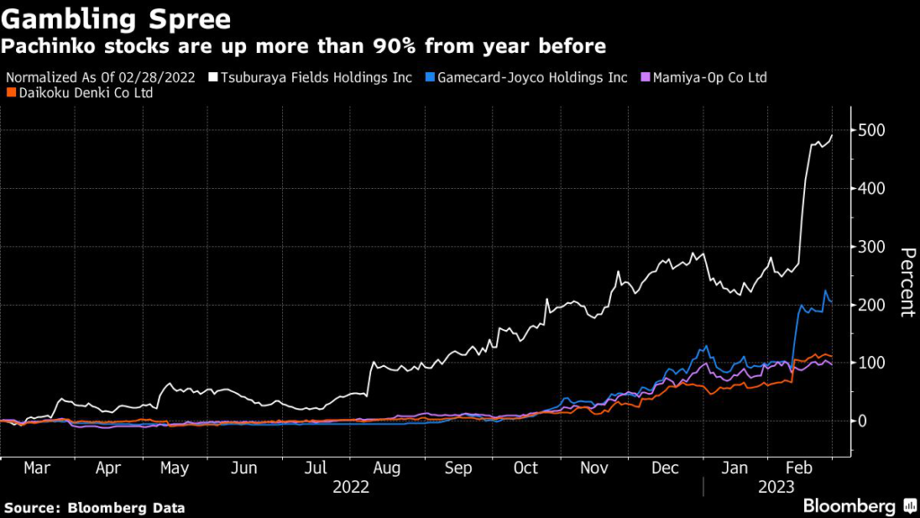 Tsuburaya Fields Holdings Inc., a pachinko machine maker, has surged nearly 500% in the last 12 months, making it the top performer on the benchmark Topix.