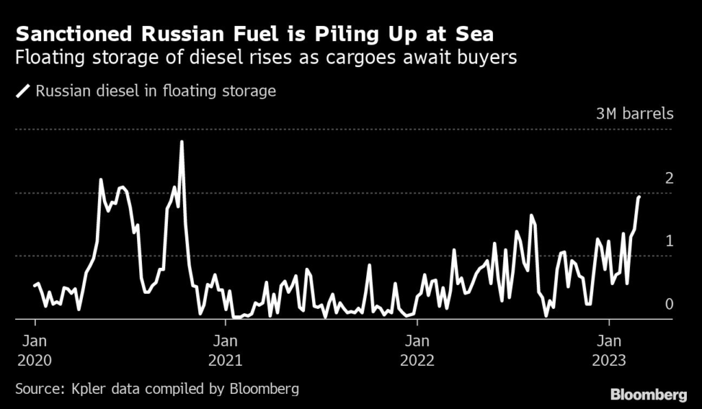 (Bloomberg) — A pile-up of Russian diesel stored on ships suggests buyers are shunning the sanctioned fuel as an exceptionally warm winter saps demand.