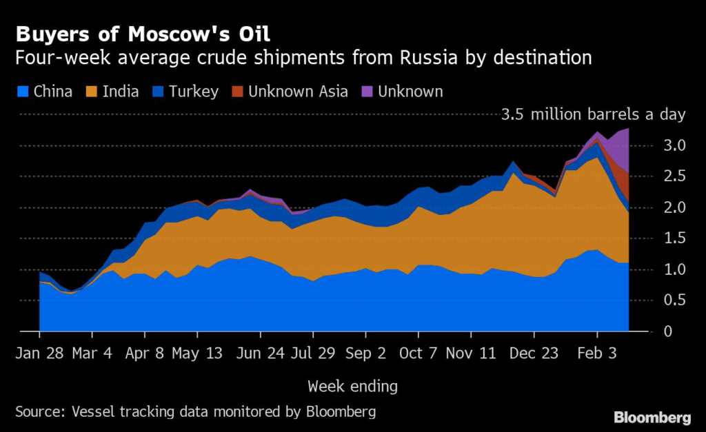 Left without the European market in the aftermath of the invasion of Ukraine, Moscow has become more reliant than ever on its biggest oil customers in India and China.