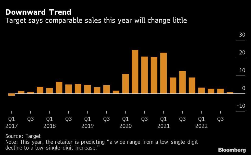 The results position Target for a rebound this year, albeit a modest one: The company said adjusted earnings would rise to no more than $8.75 a share from $6.02 in 2022, trailing the $9.25 average of analyst estimates compiled by Bloomberg.