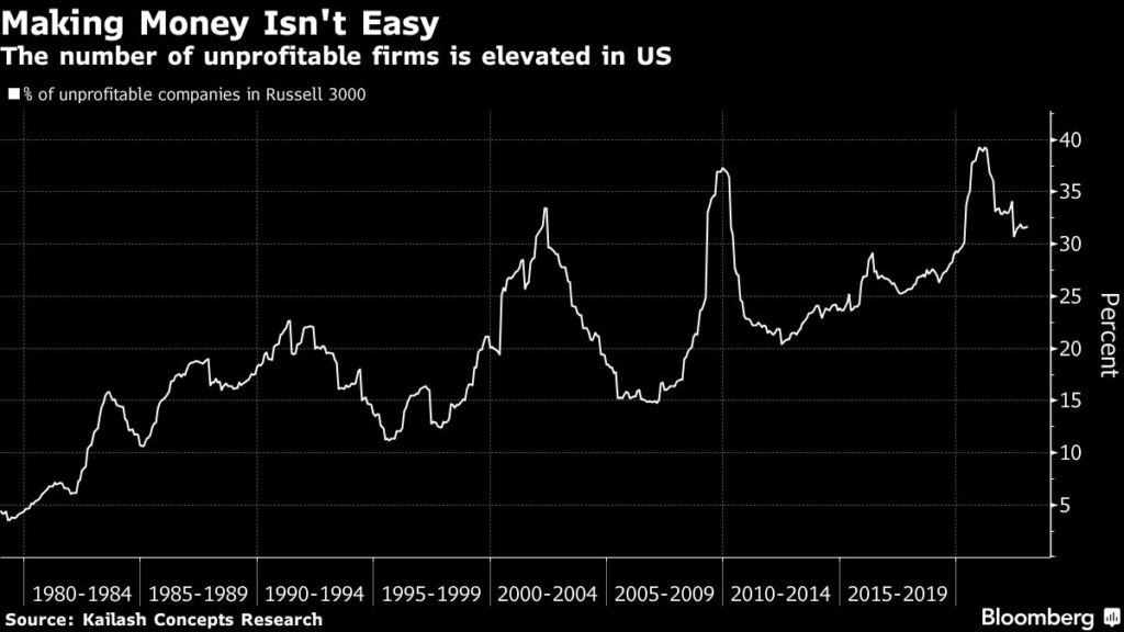 As of the 12 months through January, roughly 32% of firms in the Russell 3000 Index were losing money, according to data compiled by Kailash Concepts Research and Bloomberg.