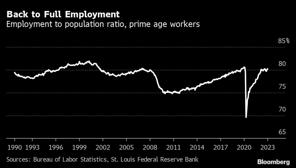 He just doesn’t think it’s as taut as some economists do. The share of the prime-age working population that’s employed is 80%, consistent with full employment but not beyond it, he said.