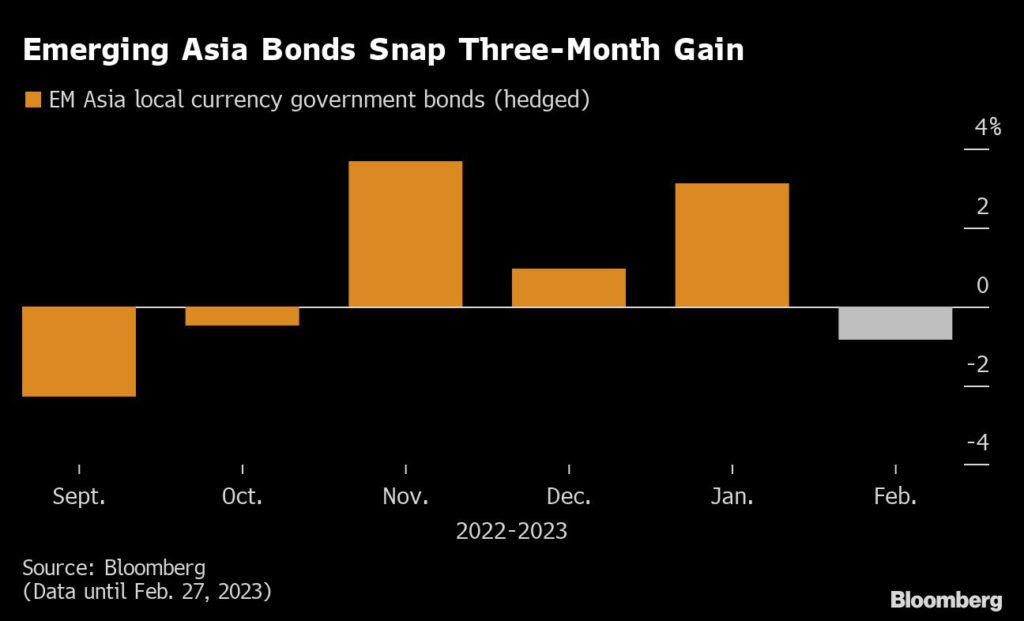 An index of emerging Asian government bonds posted its biggest monthly decline since September as higher US yields lure funds away from developing markets.