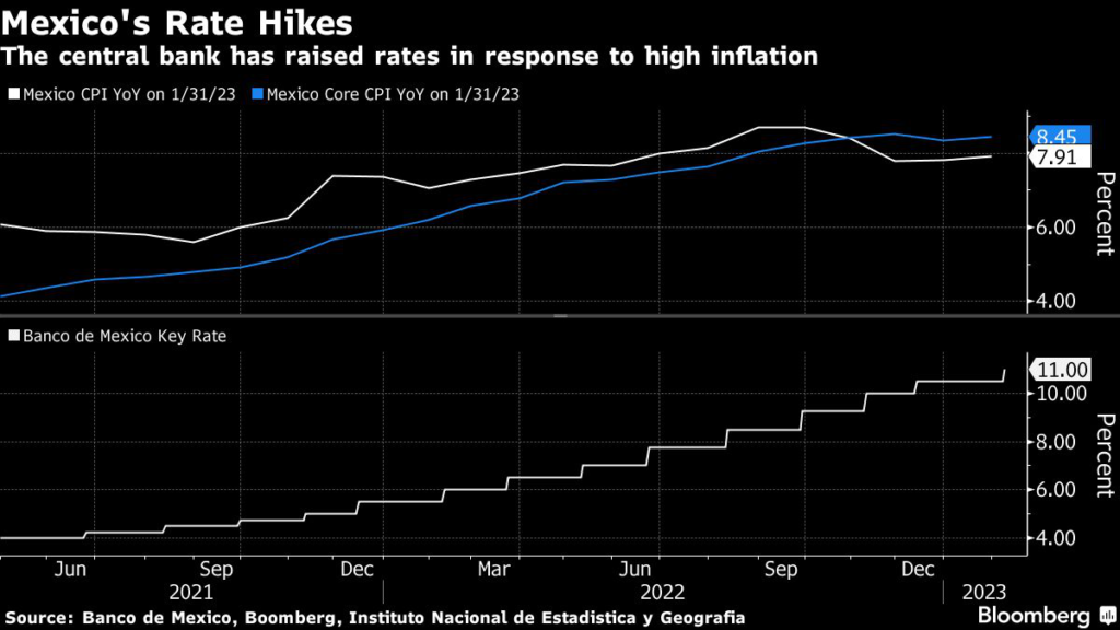 Analysts in a Citibanamex survey published last week forecast a 1.1% rise in GDP this year and 2% in 2024. Governor Victoria Rodriguez said the bank would take into account the inflation panorama and monetary policy stance already achieved when deciding the current hiking cycle’s terminal rate.