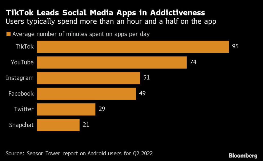 It leads the social media industry by this measure, with users spending an average of 95 minutes a day on the app globally, according to a report last year from Sensor Tower. YouTube came in second with 74 minutes, while Instagram had 51.
