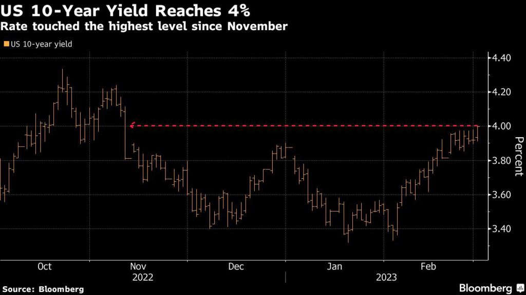 (Bloomberg) — Treasury 10-year yields topped 4% for the first time since November, signaling that the Federal Reserve’s warnings of higher-for-longer rates are finally sinking in.