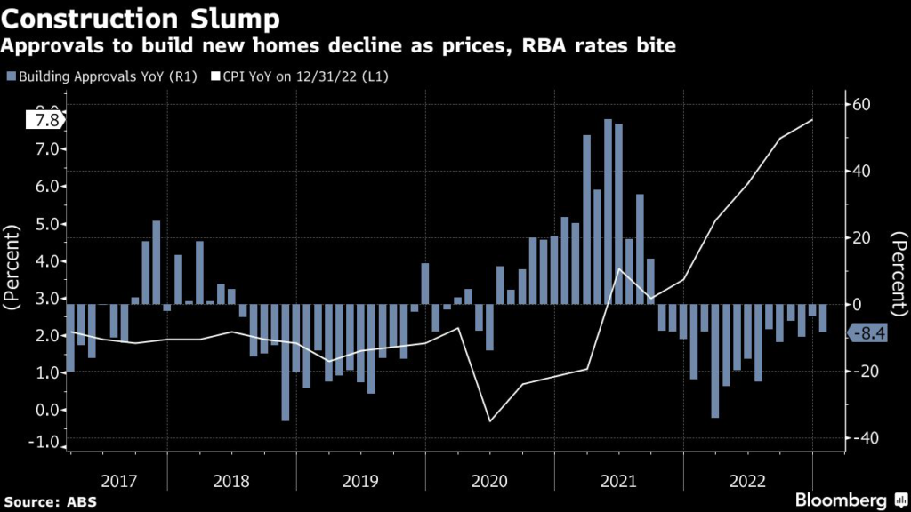 (Bloomberg) — Approvals to build new homes in Australia fell by the most on record in January, with permits for private houses tumbling, suggesting weak residential property investment will continue to drag on the economy.