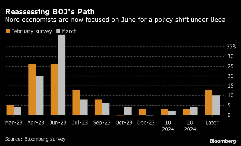(Bloomberg) — Almost two-thirds of Bank of Japan watchers now expect monetary policy change by June following the first extensive hearings of governor nominee Kazuo Ueda, according to the latest Bloomberg survey.