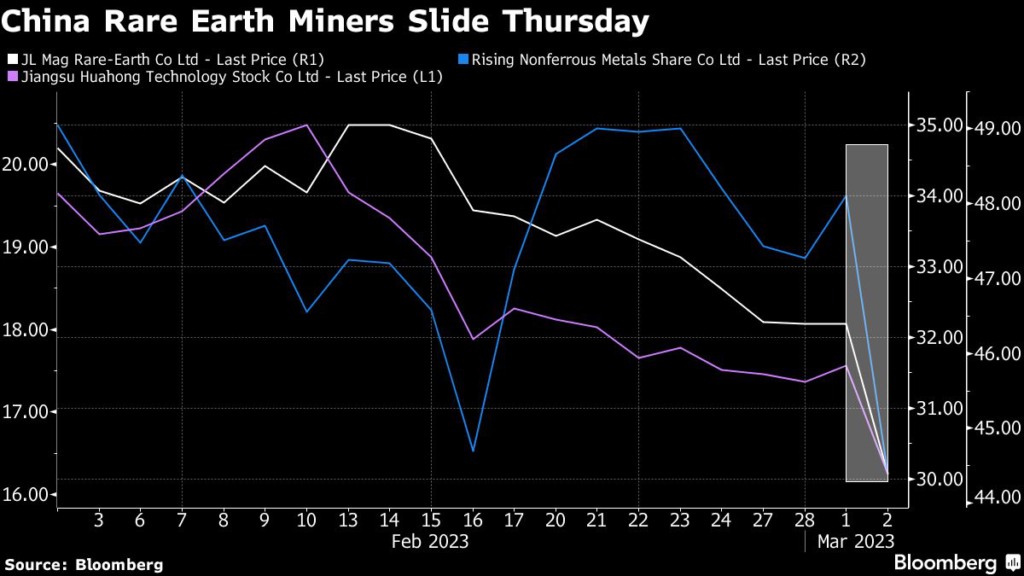 (Bloomberg) — Shares of Chinese rare-earth miners were heavily sold off following Tesla Inc.’s surprise announcement that the electric-vehicle maker will drop the use of the material in its future models.