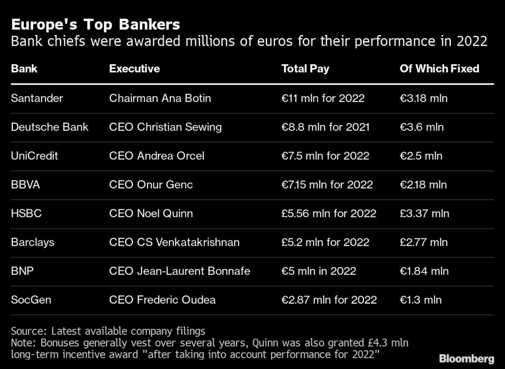 He will also receive variable compensation of as much as €6.5 million if the bank exceeds 2023 targets. The amount will be capped at €4.25 million —lower than his 2022 bonus — if it only meets the goals, leaving his total compensation flat from a year earlier.