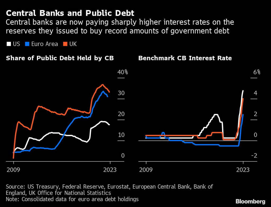 Central banks are still receiving roughly the same amount – but the interest they’re paying out on reserves has soared, in tandem with policy rates. In commercial terms, they’ve swung from profits to losses — which are set to deepen with rates increasingly expected to stay higher, for longer.