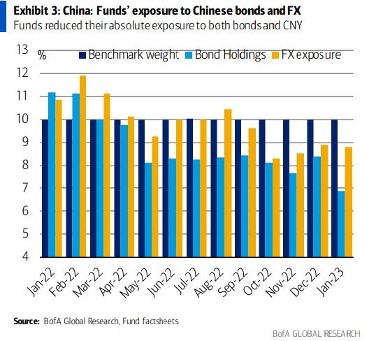 Let’s see whether there’s a follow through from long-only investors after the NPC. Funds significantly reduced their exposure to China fixed income and FX in January — as this chart from Bank of America Corp.