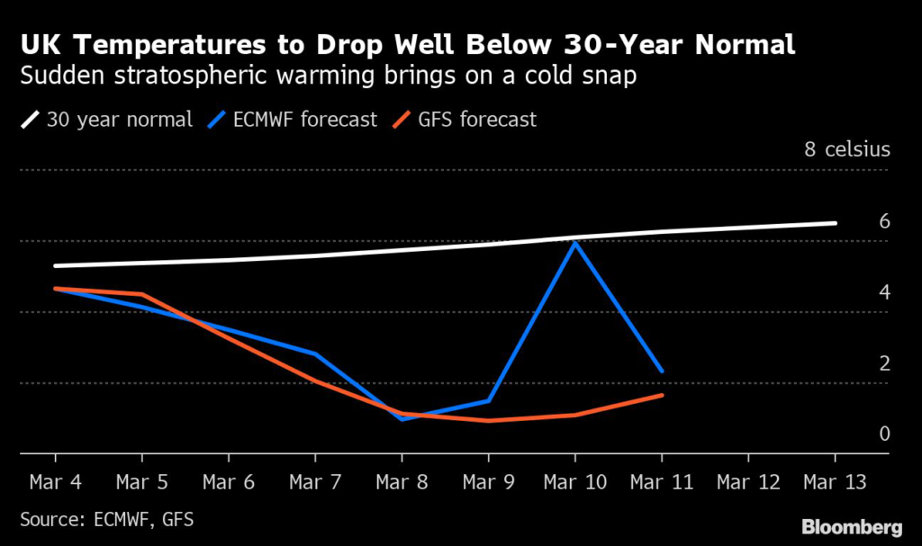 (Bloomberg) — The UK is preparing for a late blast of cold next week that could mark the start of an unusually chilly March.