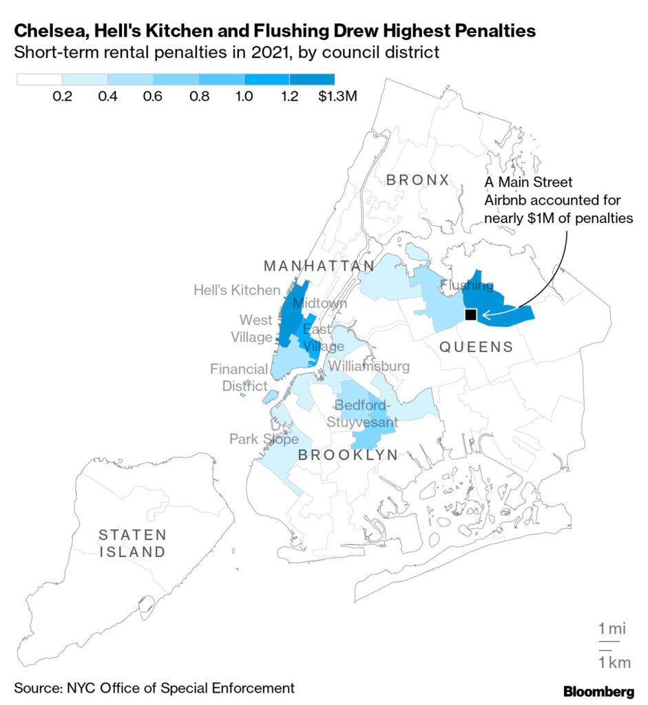 But records show only a fraction of hosts are quick to pay. In fact, the filings show many have let the penalties pile up. One property near the Port Authority in Manhattan, owned by ORJ Properties, accumulated about $170,000 in fines in 2021, according to a Bloomberg calculation of records, though some of its penalties were dismissed.
