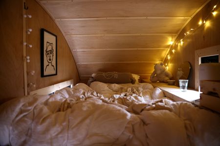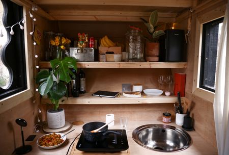 Marshall’s creative solution to the problem was to spend 4,000 pounds ($4,800) building a wooden hood with a curved roof and fixing it onto a skip. Inside, he has a small kitchen and a mezzanine bed space.